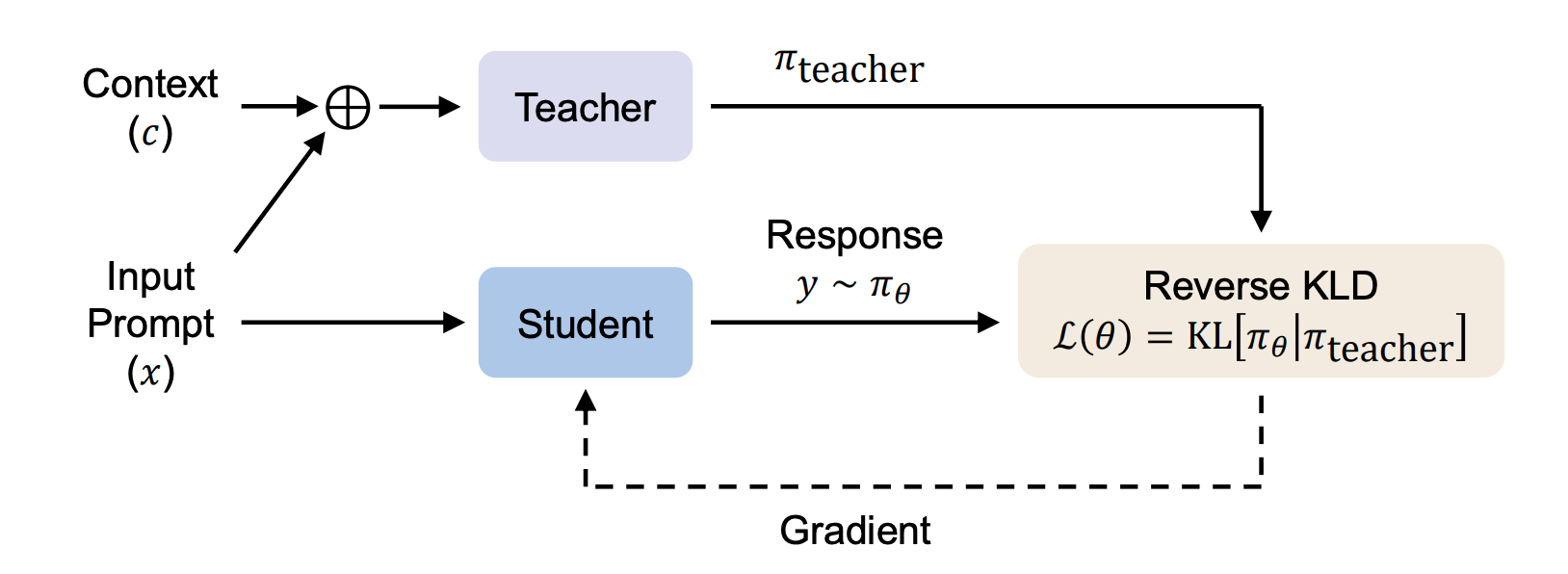 We can now formally define the solution. Across various domains, state-of-the-art methods share the same underlying structure: they all minimize the Reverse KL divergence between the student’s unconditioned policy (\(p_\theta\)) and a context-enhanced teacher (\(p_\theta(\cdot|C)\)):